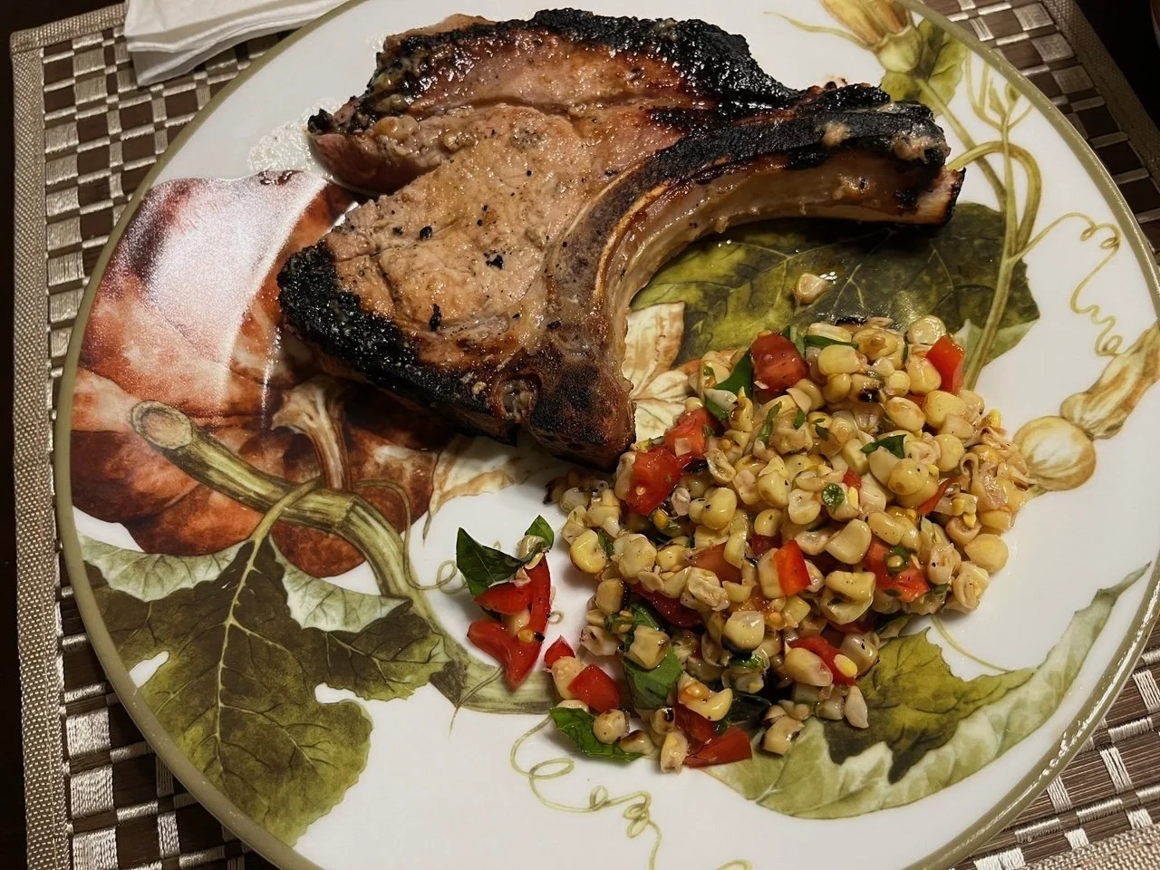 THE FOOD: Sake Kasu-Marinated Grilled Pork Chops, Grilled Corn and Red Pepper Salad